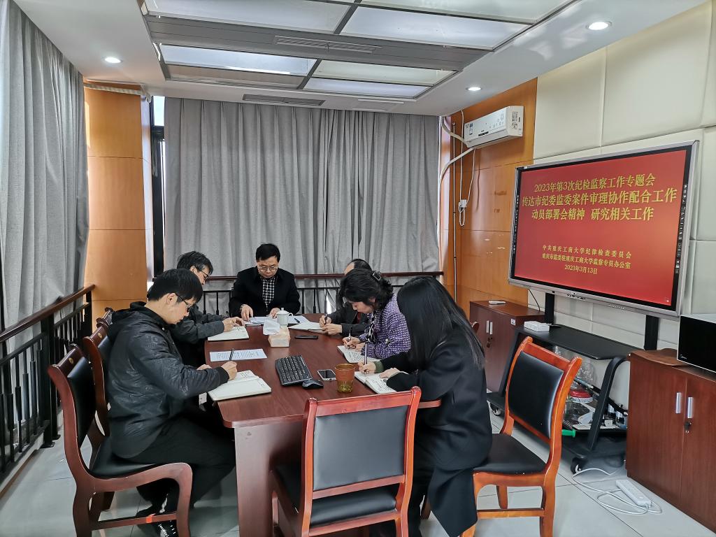 3月13日上午,学校纪委监察专员办公室在学校厚德楼6002室召开2023年第3次纪检监察工作专题会,传达市纪委监委案件审理协作配合工作动员部署会议精神,研究相关工作。会议由学校党委常委、纪委书记、监察专员周航同志主持,全体专职纪检监察干部参加会议。
