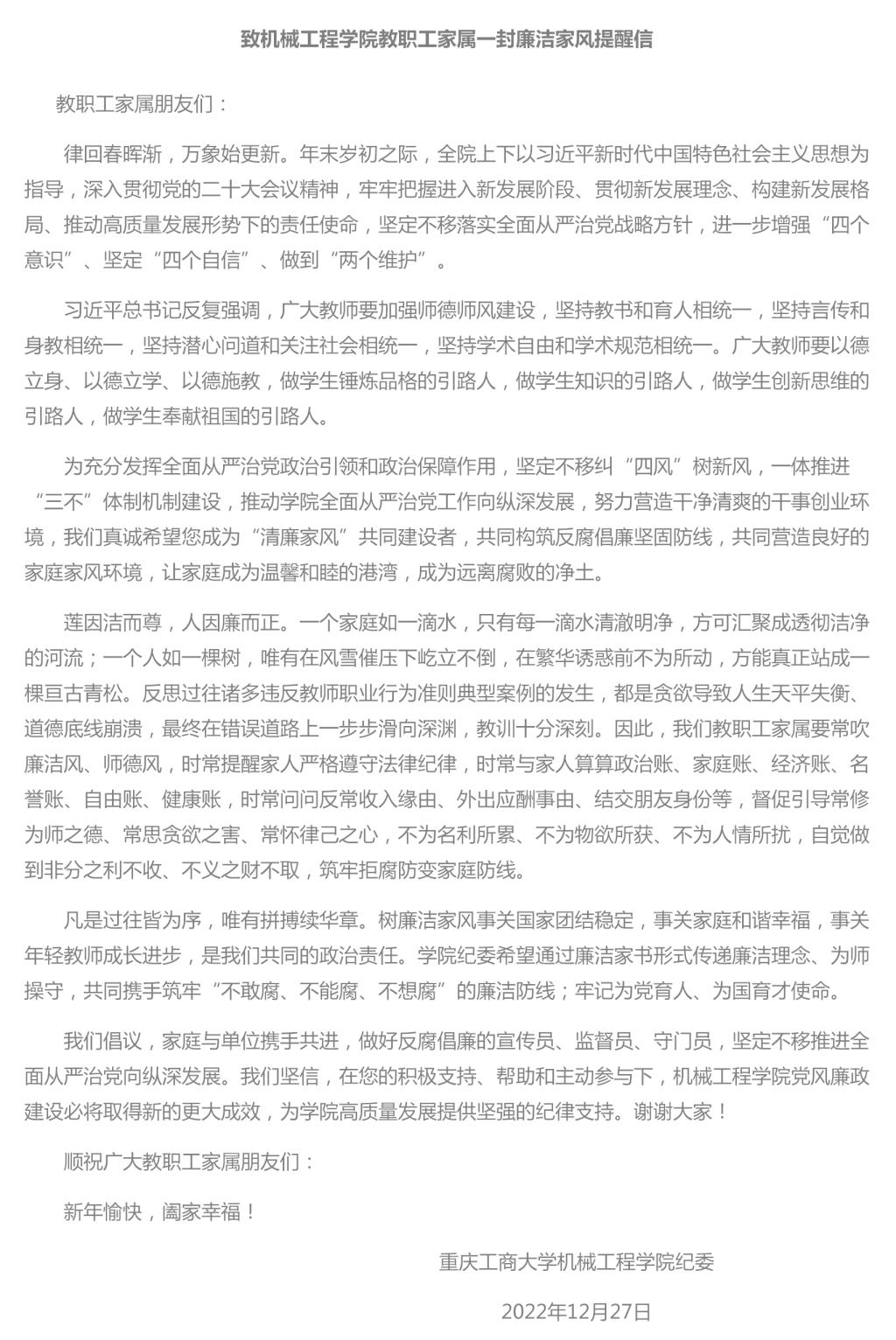 为深入贯彻习近平总书记重要讲话和党的二十大精神,坚定不移纠“四风”树新风,加强师德师风建设,努力营造干净清爽的干事创业环境,共同构筑反腐倡廉坚固防线,共同营造良好的家庭家风环境,让家庭成为温馨和睦的港湾,成为远离腐败的净土。9428cn太阳集团古天乐纪委开展家庭助廉活动,于12月27日向全院教职工家属朋友致一封廉洁家风提醒信,倡议“家庭与单位携手共进,做好反腐倡廉的宣传员、监督员、守门员”,为学院高质量发展提供坚强的纪律支持。