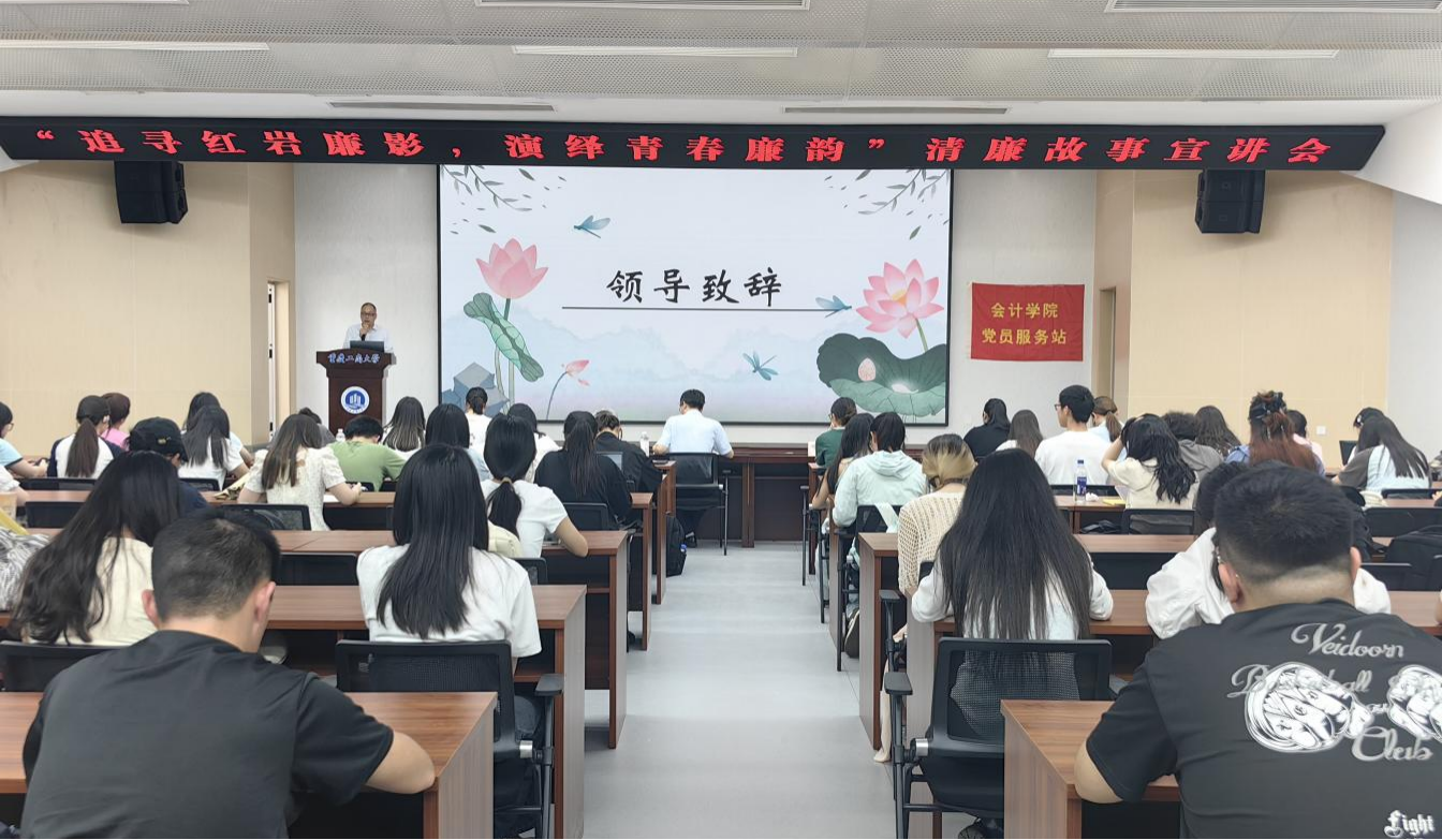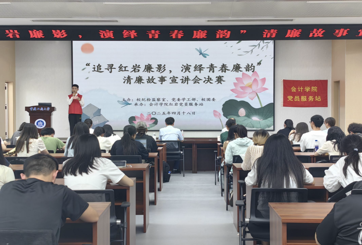 为深化党团联动机制,激活“一站式”学生社区党建育人动能,引领青年学子厚植廉洁底色、共筑校园清风生态,2025年4月18日下午,校纪检监察室、党委学工部、校团委与会计学院红岩党员服务站于明德楼1019报告厅,联合举办“追寻红岩廉影,演绎青春廉韵”清廉故事宣讲会决赛。学校纪检监察室主任苏治远、校团委书记吴佑波、会计学院党委书记邓德敏、党委副书记郝颖,携7位参赛选手及会计学院80余名师生,共同参与这场“党建+廉洁”的育人实践。